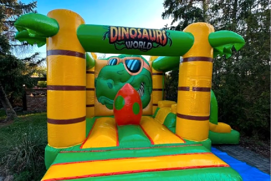 Unsere kompakte Hüpfburg mit Rutsche ist die perfekte Wahl für jeden Anlass, sei es ein Kinderfest, ein Geburtstag oder ein Tag der offenen Tür. In diesem farbenfrohen Spielparadies werden Kinder stundenlangen Spaß erleben, besonders wenn sie von Dinosauriern begeistert sind. Taucht ein in die Welt der prähistorischen Giganten, während ihr in dieser Hüpfburg springt und spielt. Aber Vorsicht vor dem T-Rex - er bewacht sein Ei sorgfältig!